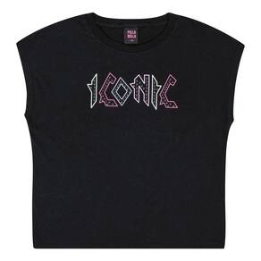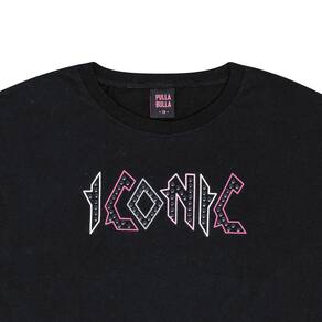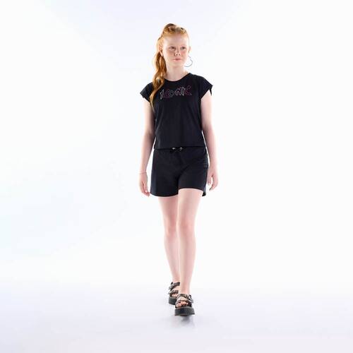 Para meninas que gostam de manter o estilo com o roupas confortáveis e despojadas. Conjunto na cor preto composto por blusa meia malha com aplique frontal metalizado escrito "Icônico" e short moletino com elástico no cós para maior conforto e movimentação. Detalhes encantadores e básicos do jeito que elas amam.