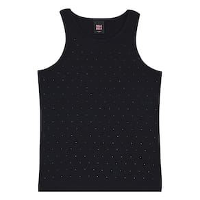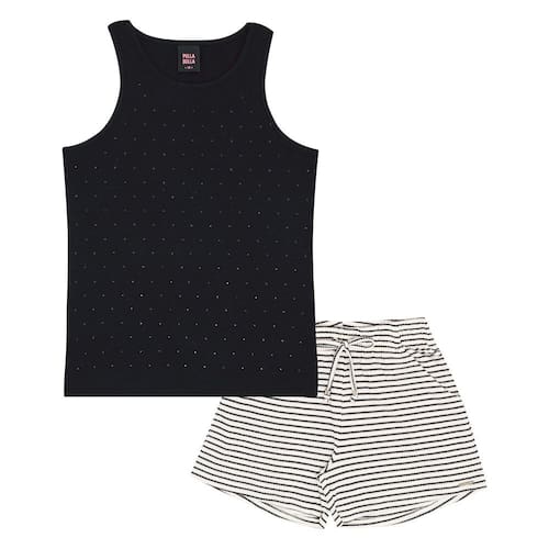 Conjunto ideal para apostar aos dias de calor! Composto por blusa cotton leve modelo regata na cor preto com aplique metalizado frontal e short malha trabalhada fio tinto listrado preto com bolsos funcionais e detalhe decorativo de cordão com ponteira de metal.