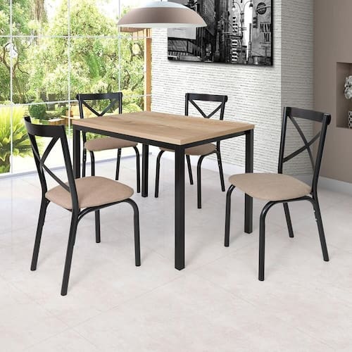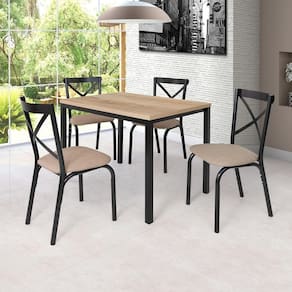 Este tipo de material é muito superior que os acabamentos em Pintura UV (que acaba sendo o tipo mais utilizado na fabricação dos móveis). Medida da Mesa (A x L x P): 78cm x 72cm x 110cm Peso da Mesa: 16,02 kg Mesa suporta até: 100 kg Acabamento da Cadeira/Banco: Pintura Epóxi Acabamento da Mesa: Pintura Epóxi Acompanha Manual de Instalação: Sim Almofada do assento: Removível Almofada do encosto: Não Possui Altura do Conjunto: 78 cm Ambiente Principal: Cozinha Cadeira/Banco estofada: Somente Assento Estofado Cadeira/Banco suporta até: 100 kg Complexidade da Montagem: Baixa: pode ser montado por uma pessoa sozinha Cor: Preto Fosco/Linho Bege/Carvalho Cor da Base: Preto Cor do Produto: Preto Fosco/Linho Bege/Carvalho Cor do Tampo: Bege Cor Secundária: Bege De Canto (Canto Alemão): Não Design da Base: 4 Pés Escala de Brilho: Fosco Espessura do Tampo: 30 mm Estrutura do Assento: Madeira/Espuma/Sintético Estrutura do Encosto: Aço Formato do Tampo: Retangular Itens Inclusos: 1 Base de Mesa, 4 Cadeiras, 1 Tampo de Madeira, Kits de Parafusos e manual de montagem Linha ou Coleção: Karina Manual de Montagem e Instalação: https://product-hub-prd.madeiramadeira.com.br/910657/documents/f67941e4-1144-4ee1-9d99-1b0da95ae6df198519160017168350060866.pdf Material da Base da Mesa: Aço Carbono Material da Estrutura da Cadeira: Aço Carbono Material do Tampo: BP Material Principal: Aço Carbono Material Principal das Cadeiras/Bancos: Aço Carbono Medida da Cadeira/Banco (A x L x P): 90cm x 50cm x 53cm Medida do Tampo (L x C x E): 72cm x 110cm x 3cm Mesa Dobrável: Não Mesa Extensível: Não Necessita Montagem: Sim Origem do Produto: Nacional Peso da Cadeira/Banco: 4,25 kg Possui Apoio para Braços: Não Possui Apoio Para os Pés: Não Possui Prateleiras: Não Possui Rodízio: Não Possui Suporte Giratório: Não Possui Vidro: Não Quantidade de Cadeiras: 4 Quantidade de Lugares: 04 Recomendações de Uso, Manutenção e Limpeza: Não utilizar produtos quimicos na limpeza, nâo expor a chuva, nâo reclinar, nâo pisar Sistema de Montagem: Parafusos Tipo de Assento: Removível Tipo de Encosto: Fixo