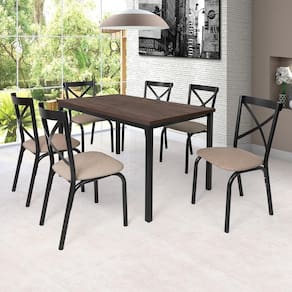 Este tipo de material é muito superior que os acabamentos em Pintura UV (que acaba sendo o tipo mais utilizado na fabricação dos móveis). Medida da Mesa (A x L x P): 78cm x 80cm x 136cm Peso da Mesa: 19,96 kg Mesa suporta até: 10 kg Acabamento da Cadeira/Banco: Pintura Epóxi Acabamento da Mesa: Pintura Epóxi Acompanha Manual de Instalação: Sim Almofada do assento: Removível Almofada do encosto: Não Possui Altura do Conjunto: 78 cm Ambiente Principal: Cozinha Cadeira/Banco estofada: Somente Assento Estofado Cadeira/Banco suporta até: 100 kg Complexidade da Montagem: Baixa: pode ser montado por uma pessoa sozinha Cor: Preto Fosco/Linho Bege/Amendoa Cor da Base: Preto Cor do Produto: Preto Fosco/Linho Bege/Amendoa Cor do Tampo: Marrom Cor Secundária: Bege De Canto (Canto Alemão): Não Design da Base: 4 Pés Escala de Brilho: Semi-Brilho Espessura do Tampo: 30 mm Estrutura do Assento: Madeira/Espuma/Sintético Estrutura do Encosto: Aço Formato do Tampo: Retangular Itens Inclusos: 1 Base de Mesa, 6 Cadeiras, 1 Tampo de Madeira, Kits de Parafusos e manual de montagem Linha ou Coleção: Karina Manual de Montagem e Instalação: https://product-hub-prd.madeiramadeira.com.br/910627/documents/0d2ddc25-a42c-4f9a-b71b-487e1f66f88a198468060017168307630292.pdf Material da Base da Mesa: Aço Carbono Material da Estrutura da Cadeira: Aço Carbono Material do Tampo: BP Material Principal: Aço Carbono Material Principal das Cadeiras/Bancos: Aço Carbono Medida da Base (A x L x P): 75cm x 80cm x 136cm Medida da Cadeira/Banco (A x L x P): 90cm x 50cm x 53cm Medida do Tampo (L x C x E): 80cm x 136cm x 3cm Mesa Dobrável: Não Mesa Extensível: Não Necessita Montagem: Sim Origem do Produto: Nacional Peso da Cadeira/Banco: 4,25 kg Possui Apoio para Braços: Não Possui Apoio Para os Pés: Não Possui Prateleiras: Não Possui Rodízio: Não Possui Suporte Giratório: Não Possui Vidro: Não Quantidade de Cadeiras: 6 Quantidade de Lugares: 06 Recomendações de Uso, Manutenção e Limpeza: Não utilizar produtos quimicos na limpeza, nâo expor a chuva, nâo reclinar, nâo pisar Sistema de Montagem: Parafusos Tipo de Assento: Removível Tipo de Encosto: Fixo