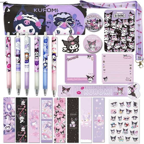 - O que você recebe: o conjunto Kawaii inclui 6 canetas, 8 marcadores, 1 porta-cartões com cordão, 2 notas adesivas fofas, 1 régua, 1 chaveiro, 2 emblemas de botão, 22 adesivos