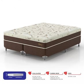 Colchão com Estrutura interna composta de molas ensacadas individualmente, Espuma poliuretano densidade 26kg/m3, EPS - Poliestireno Expandido, feltro resinado e TNT 100g. Faixa lateral e tampo no tecido sintel 100% Poliéster, fundo do produto TNT 100g ati derrapante. Cor da faixa lateral marrom, Tampo bege com estampa floral. Box com madeira pinus e eucalipito, revestido com tecido sintel cor marrom na faixa lateral, TNT 70g preto na parte de cima e na parte de baixo. Abertura para Ventilação: Não Acompanha Cama Auxiliar: Não Acompanha Colchão: Sim Altura da Base Box (Sem o Colchão): 25 Altura do Colchão (Sem a Base Box): 26 Ambiente Principal: Quarto Antiácaro: Sim Antialérgico: Sim Antifungo: Sim Cantoneiras: Sim Cor: Bege e Marrom Cor do Produto: Bege e Marrom Informações Complementares: Colchão com tecido 100% poliéster, design inovador e estampa floral, é um tecido mais resistente aos desgastes do dia a dia, pois não fura ou desfia com facilidade. Sua estrutura é composta por espuma poliuretano densidade 26kg/m2 que dá mais conforto par Itens Inclusos: 1 Colchão, 2 Box Linha ou Coleção: Linha Manual de Montagem e Instalação: https://product-hub-prd.madeiramadeira.com.br/871153/documents/86fa930c-cc41-47ab-a1d2-7225f392a13dmanualdemontagemdoboxcasal.pdf Material da Estrutura: Pinus Material dos Pés: Plástico Necessita Montagem: Sim Nível de Conforto: Intermediário Origem do Produto: Nacional Peso: 69.2 Pillow: Pillow Euro Possui Baú: Não Possui Pillow: Sim Precisa virar: Não Recomendações de Uso, Manutenção e Limpeza: Seguir manual de instruções. Revestimento: Jacquard Poliéster Revestimento da Base Box: Acabamento com linhas poliester Tamanho: King Tamanho de Colchão: King Tipo do Colchão: Mola