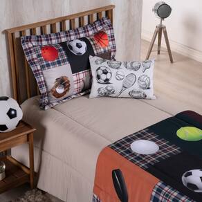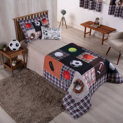 QUANTIDADE DE PEÇAS E MEDIDAS APROXIMADAS (COMPRIMENTO X LARGURA): 01 Edredom Estampado Juvenil Menino: 2,50m x 1,90m; 01 Porta Travesseiro Estampado com Aba: 70cm x 50cm (medida útil); 01 Capa para Almofada Estampada: 55cm x 35cm; 01 Refil Enchimento de Almofada: 60cm x 40cm; 01 Cortina Infantil Juvenil: 2,00m x 1,50m.