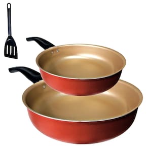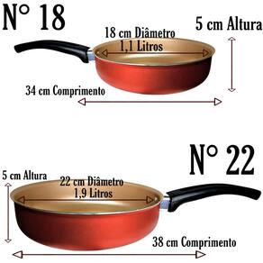 Cozinhar é a arte de misturar sabores e encantar, é na cozinha que a mágica acontece, que os amigos se reúnem, que as alegrias se multiplicam .... Beleza, charme, praticidade na hora de cozinhar, você vai se encantar por essas Frigideiras, sua cozinha merece esse mimo! Kit Frigideira Alta 22 cm e 18 cm Antiaderente, item indispensável na sua cozinha, produzido com alumínio de alta qualidade, espessura de 1,1 mm, peça com maior resistência e durabilidade, alumínio que distribui melhor o calor, proporcionando um cozimento mais rápido e uniforme do alimento, Frigideira Revestidas com 5 camadas de antiaderente TEFLON (DuPont) - PFOA Free, internamente e externamente, evitando que o alimento grude na superfície, o que facilita no preparo dos alimentos e proporciona praticidade no momento da limpeza. Possui cabo com espaçador metálico, feito em baquelite, um material antitérmico, que não retém calor, contribuindo para um manuseio mais confortável e seguro. Além disso, a frigideira acompanha uma linda Espátula, ideal para a conservação e durabilidade do seu produto!Especificações Técnicas:Dimensões aproximadas - cm: (A x L x C):- 1 Frigideira Alta 22 cm Antiaderente – 5 x 23 x 38 cm- 1 Frigideira Alta 18 cm Antiaderente - 5 x 19 x 34 cm- 1 Espátula de Nylon Material: Alumínio RevestidoRevestimento Interno: Antiaderente Teflon - Pro FlonRevestimento Externo: Antiaderente Teflon Espessura Material: 1,1mmCabo: BaqueliteTampa: (não acompanha)Peso: 285 gPeso Embalagem: 170 gEmbalagem: Saco Plástico / Caixa PardaDimensões aproximadas da embalagem (AxLxP): 5 x 25 x 40 cmCuidados:- Antes de usar pela primeira vez, lave com esponja macia, detergente neutro, depois de secar, unte a área interna com óleo e aqueça em fogo baixo por 1 minuto. Deixe esfriar é só lavar e seu produto está pronto para uso, sempre em fogo baixo ou médio (nunca superior a 350°C);- Ideal para fogão a gás, elétrico e vitrocerâmico com resistência elétrica;- Para mexer os alimentos use somente utensílios de silicone ou nylon;- Nunca utilize solventes, objetos cortantes ou abrasivos e ou pontiagudos;- Mantenha o produto sobre a chama do fogão apenas o necessário para o cozimento;- Não exponha as alças e cabos diretamente ao fogo ou fonte de calor prolongado;- Não pode ser levada ao forno e/ou microondas;- Evite a imersão do produto quente em água fria. Sempre o deixe esfriar antes de lavar;- Para maior durabilidade do produto recomenda-se secar bem antes de guardar.Informações do Fabricante: Coisas & Trecos possui 18 anos de experiência no mercado de alumínio e utensílios para casa. A Coisas & Trecos tem como norte o desenvolvimento com estreitas e duradouras parcerias com fabricantes e fornecedores, com o objetivo de entregar aos seus clientes produtos de qualidade.Garantia do fornecedor: 30 dias contra defeitos de fabricação.Detalhes:- Com Antiaderente Teflon PFOA Free, que garante a ausência de elementos nocivos à saúde em sua composição- Ao comprar o Kit Frigideira Alta 22 cm e 18 cm Antiaderente, você receberá em seu endereço: 01 Frigideira 22 cm , 01 Frigideira 18 cm e uma Espátula de Nylon. - Itens decorativos não acompanham o produto. Imagens meramente ilustrativas (a cor do produto pode sofrer alteração de acordo com a qualidade do monitor).- Para descarte dos produtos e embalagens siga as orientações de reciclagem vigente.Estamos à disposição para qualquer dúvida. Agradecemos a sua visita e aguardamos seu pedido!