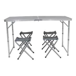 Conjunto mesa e 4 bancos dobráveis para camping cinza Marca: just home collection Garantia: 3 meses Cor: cinza Material: alumínio, plástico e poliéster oxford. Origem: importado Uso: externo Capacidade: 4 pessoas. Lavável: sim Precauções: não deixe exposto a chuva e sol. Número de peças: 5 Dobrável: sim Incluso: 1 mesa e 4 bancos. Qualidade: alta resistência e durabilidade. Tonalidade: cinza Ean: 8412842528673