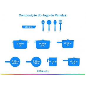 1x Forma Canelada - 24cm - 1,4 L 1x Frigideira - 13cm - 500 mL 1x Caçarola - 20cm - 2,8 L 1x Caçarola - 18cm - 2 L 1x Panela - 18cm - 2 L 1x Panela - 16cm - 1,4 L 1x Frigideira - 18cm - 700 mL 1x Fervedor 12cm - 1 L 1x Colher de arroz 1x Espátula 1x Concha 1x Pegador de massa