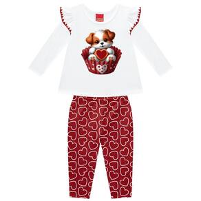 Conjunto Kyly Infantil Menina Blusa Legging Vermelho Inverno - Conjunto Infantil Menina Blusa Branca com Cachorrinho e Legging Vermelha com Corações da Kyly!