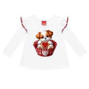 A blusa em meia malha, na cor branca, traz uma estampa fofa de cachorrinho que conquista à primeira vista. O destaque fica por conta do babado delicado nas mangas, que adiciona um toque feminino e alegre à peça. A modelagem confortável com gola redonda oferece liberdade para brincar e se movimentar com tranquilidade.