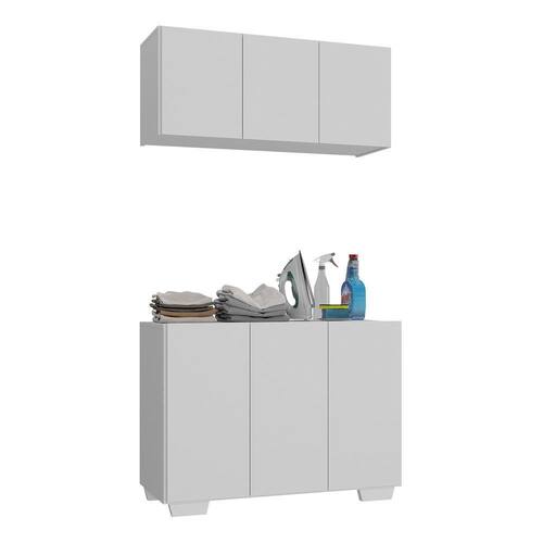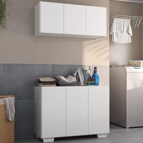 Transforme sua lavanderia num ambiente funcional e elegante com o Conjunto Lavanderia Multiuso Armário Aéreo e Balcão 3 Portas Multimóveis MP5051. Fabricado em MDP (15mm) com acabamento acetinado (cerca de 20% de brilho), garante durabilidade e resistência. Composto por um balcão e um armário aéreo com 3 portas e prateleiras, este kit oferece amplo espaço interno para organizar produtos de limpeza e outros itens de lavanderia. O balcão ainda permite apoiar suas roupas, deixando o ambiente organizado, e possui pés quadrados em polipropileno que oferecem estabilidade e estilo único. O design clean confere um visual moderno e estiloso ao kit.