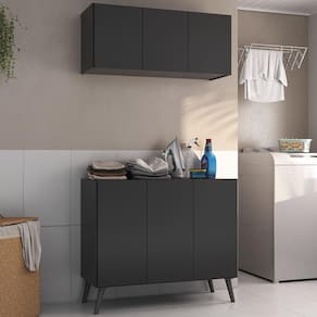 Transforme sua lavanderia num ambiente funcional e elegante com o Conjunto Lavanderia Retrô Multiuso Armário Aéreo e Balcão 3 Portas Multimóveis MP5050. Fabricado em MDP (15mm) com acabamento acetinado (cerca de 20% de brilho), garante durabilidade e resistência. Composto por um balcão e um armário aéreo com 3 portas e prateleiras, este kit oferece amplo espaço interno para organizar produtos de limpeza e outros itens de lavanderia. O balcão ainda permite apoiar suas roupas, deixando o ambiente organizado, e possui pés retrô em polipropileno que oferecem estabilidade e um charme vintage. O design clean confere um visual moderno e estiloso ao kit.