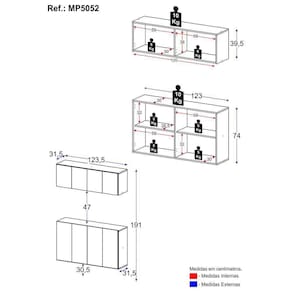 Dimensões do produto montado: Armário Aéreo - Altura: 39,5cm | Largura: 123,5cm | Profundidade: 31,5cm Balcão - Altura: 74cm | Largura: 123cm | Profundidade: 31,5cm *Você pode consultar as medidas detalhadas na imagem técnica do produto.