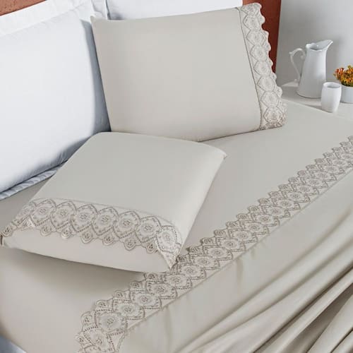 Conjunto De Lencol Casal Super King London Bordado Inglês 200 Fios NOBLESS Cor: Amendoa