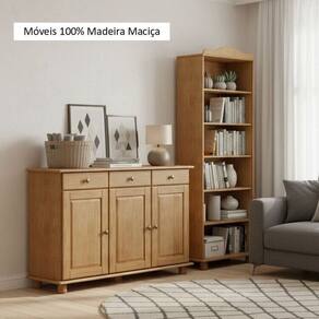 O equilíbrio perfeito entre organização e estilo! O livreiro, com estrutura em madeira maciça na cor Freijó, é ideal para livros e decoração, trazendo leveza e sofisticação ao ambiente. Já o balcão oferece funcionalidade com 3 portas e 3 gavetas, pés torneados e acabamento acetinado que valoriza os veios naturais da madeira. Um combo rústico e elegante que transforma qualquer espaço com personalidade e aconchego! Acabamento: Pintura UV Altura do Conjunto: 190 cm Ambiente: null Ambiente Principal: Sala de Estar Cor: Freijó Informação Complementar: 1x Buffet Aparador Rústico 100% Madeira Maciça 3 Portas 3 Gavetas Linha Rubi Freijó Largura: 128,4 cm Altura: 85,5 cm Peso: 29,42 kg Profundidade: 43 cm Necessita Montagem: Sim