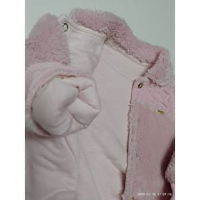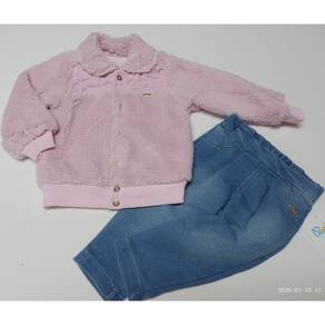 - Casaco duplo, macio, quente e confortável. Na parte externa todo em pelo, muito fofinho ao sentir em mãos. Detalhe matelado e plaquinha da marca na frente, que deixam a peça ainda mais encantadora. Possui punhos e barra ribanados. Abertura na frente com botões de pressão. Sua pequena ainda mais charmosa e confortável! - Calça em jeans, super confortável. Detalhe de plaquinha da marca aplicada na frente. Cós traseiro de elástico, que se ajusta melhor ao corpo da bebê. Simplesmente um encanto!