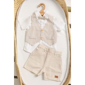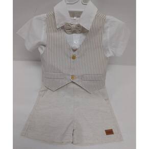 Características do produto: - Camisa manga curta social em tecido liso, super macia, leve e confortável qualidade Lessakids. Gola estilo polo. Abertura por botões na frente. Um luxo! - Bermuda em tecido estilo linho, super macia, leve e confortável. Detalhe de plaquinha da marca aplicada na frente. Dois bolsos frontais. Cós traseiro de elástico. - Colete em tecido super leve, macio. Detalhe de estampa listrada, recorte frontal. Abertura por botões de madeira. - Acompanha ainda gravatinha borboleta com elástico, pode ser removida e usada com outras peças. Conjunto maravilhoso!