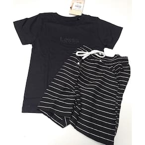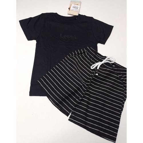- Camiseta em malha 100% algodão, super macia e confortável. Modelo básico, detalhe estampado da marca na frente. Gola redonda. - Bermuda super macia, leve e confortável. Bolsos laterais. Estampa listrada maravilhosa e cordão aplicado na frente. Cós de elástico. Conjunto maravilhoso para os dias mais quentes.