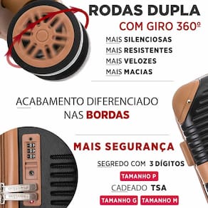Conjunto Mala Viagem Santino Krabi Pequena, Média e Grande Cor: Preto Conjunto de Malas Krabi 3 Peças Rígida 360 Santino Viajar com praticidade e estilo ficou ainda mais fácil com a linha Krabi Santino. Produzidas em ABS de alta qualidade com detalhes em material sintético elegante, as malas oferecem resistência, durabilidade e um design moderno que se destaca em qualquer viagem. O conjunto conta com três tamanhos diferentes P, M e G para atender todas as suas necessidades, desde viagens rápidas até longos trajetos. Todas possuem rodas com giro 360, que garantem mobilidade leve e silenciosa, além de alça telescópica regulável e acabamento emborrachado para maior conforto no manuseio. Segurança reforçada: Mala pequena com fechadura numérica integrada. Malas média e grande com cadeado TSA, alça lateral, base de apoio e sistema expansível de até 20% mais espaço. Organização interna completa: Forro em tecido de alta qualidade Bolso divisor com zíper Bolso telado Elásticos de fixação com trava Dimensões e capacidades: Pequena 22 : 57x36x24cm Peso 2,83kg Até 10kg Média 24 : 66x45x27cm Peso 3,69kg Até 23kg Grande 28 : 76x52x30cm 105cm com carrinho Peso 4,45kg Até 30kg Ideal para quem busca um conjunto resistente, espaçoso e sofisticado com ótimo custo-benefício, o Conjunto de Malas Krabi Santino é a escolha certa para transformar sua experiência de viagem. Marca: Não Informado