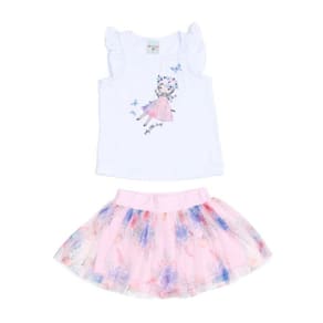 Conjunto manga curta com estampa menina no balanço, saia tule estampado Have Fun