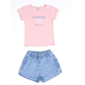 Conjunto meia manga com estampa de raquetes champions, shorts jeans com elastano Have Fun