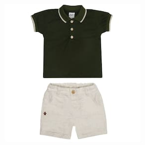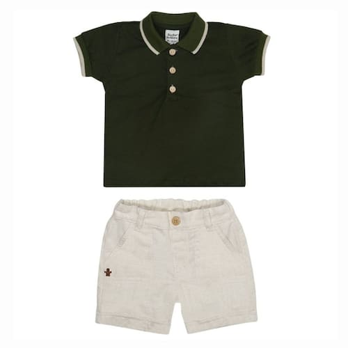 Conjunto Infantil Menino Verde com Blusa Pólo + Bermuda Sarja Bege Naturale 2Pçs - Sonho Mágico: Charme e Conforto para o seu Príncipe