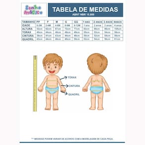 Medidas das Peças: Tamanho 1: Blusa - Altura: 36 cm / Largura:28 cm - Shorts: Cintura: 23 cm / Comprimento: 26 cm Tamanho 2: Blusa - Altura: 38 cm / Largura:30 cm - Shorts: Cintura: 25 cm / Comprimento: 29 cm Tamanho 3: Blusa - Altura: 40 cm / Largura:32 cm - Shorts: Cintura: 27 cm / Comprimento: 31 cm Tamanho 4: Blusa - Altura: 43 cm / Largura:33 cm - Shorts: Cintura: 28 cm / Comprimento: 33 cm