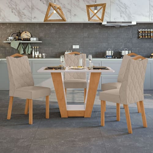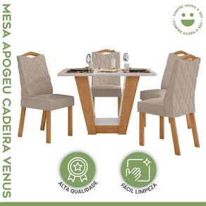 O conjunto de mesa Apogeu de 120cm, com tampo de vidro, e quatro cadeiras Vênus oferece uma solução elegante e compacta para sua sala de jantar. A mesa, com seu design moderno e tampo de vidro, adiciona um toque de sofisticação ao ambiente, enquanto sua estrutura sólida garante estabilidade. As quatro cadeiras Vênus, com seu design contemporâneo e estofamento confortável, proporcionam tanto estilo quanto conforto durante as refeições. Juntos, criam um espaço convidativo e elegante para refeições em família ou encontros com amigos, perfeito para espaços menores que exigem funcionalidade e estilo. Medida da Mesa (A x L x P): 77,2cmx120cmx80cm Peso da Mesa: 37,23 kg Mesa suporta até: 40 kg Acabamento da Cadeira/Banco: Pintura Acabamento da Mesa: Pintura UV Acompanha Manual de Instalação: Sim Almofada do assento: Fixa Ambiente Principal: Sala de Jantar Cadeira/Banco estofada: Encosto e Assento Estofados Cadeira/Banco suporta até: 120 kg Complexidade da Montagem: Média: pode ser montado por mais de uma pessoa e/ou necessite de maior conhecimento para montagem Cor: Amêndoa Clean/Off White/Bege Cor da Base: Marrom Cor do Produto: Amêndoa Clean/Off White/Bege Cor do Tampo: Bege Cor Secundária: Marrom De Canto (Canto Alemão): Não Design da Base: Em U Enchimento do Assento: Espuma D-20 Enchimento do Encosto: Espuma D-18 Escala de Brilho: Fosco Espessura do Tampo: 26 mm Espessura do Vidro: mm Estrutura do Assento: MDF/MDP 25mm Estrutura do Encosto: MDF Formato do Tampo: Retangular Itens Inclusos: 1 Mesa com 4 Cadeiras, Ferragens e Manual de montagem Linha ou Coleção: Apogeu Manual de Montagem e Instalação: https://product-hub-prd.madeiramadeira.com.br/912573/documents/3b55ddfa-0e49-491f-a79f-f83945b51105423APOGEU2012020COM20VENUS.pdf Material da Base da Mesa: MDF/MDP Material da Estrutura da Cadeira: MDF Material do Tampo: Vidro/MDF Material Principal: MDF/MDP Material Principal das Cadeiras/Bancos: MDF Medida da Cadeira/Banco (A x L x P): 104cmx58cmx46,5cm Medida do Tampo (L x C x E): 120cm80cmx22mm Mesa Dobrável: Não Mesa Extensível: Não Necessita Montagem: Sim Origem do Produto: Nacional Peso da Cadeira/Banco: 9 kg Possui Apoio para Braços: Não Possui Apoio Para os Pés: Não Possui Prateleiras: Não Possui Rodízio: Não Possui Suporte Giratório: Não Possui Vidro: Sim Quantidade de Cadeiras: 4 Quantidade de Lugares: 04 Recomendações de Uso, Manutenção e Limpeza: Limpar com flanela limpa e seca. Não usar produtos abrasivos. Revestimento da Cadeira/Banco: Linho Sistema de Montagem: Parafusos Tipo de Assento: Fixo Tipo de Encosto: Fixo