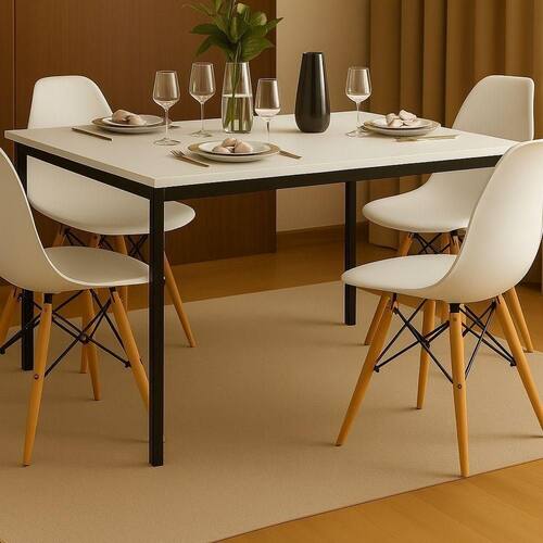Design moderno e atemporalEstrutura metálica reforçadaTampo branco em madeira de alta qualidadeCadeiras Eames brancas ergonômicas e elegantesFácil de montar e limparIdeal para salas de jantar, cozinhas e espaços gourmet