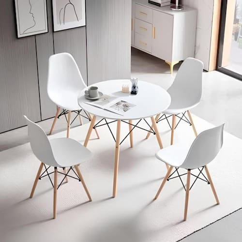 Conjunto Mesa 90cm + 4 Cadeiras Charles Eames Eiffel Trevisul é composta por uma mesa redonda e quatro cadeiras: Mesa Charles Eames Eiffel é um produto de montagem simples e rápida, feita de material resistente estrutura de MDF 15mm e pés de madeira. Medidas: Altura: 760mm e Diâmetro: 900cm. A cadeira Charles Eames Eiffel com estrutura de polipropileno e pés de madeira. Medidas: Altura: 825mm x Largura: 460mm x Profundidade: 510mm