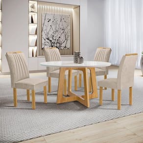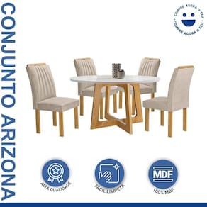 Transforme sua sala de jantar com o conjunto Mesa Arizona redonda, acompanhado por quatro cadeiras. Com um design moderno e elegante, esta mesa oferece o cenário perfeito para refeições íntimas e conversas animadas. As quatro cadeiras, confortáveis e estilosas, complementam a mesa, proporcionando uma experiência de jantar agradável. Juntos, este conjunto cria um ambiente acolhedor e convidativo para momentos especiais à mesa. Medida da Mesa (A x L x P): 79cmx120cmx90cm Peso da Mesa: 40,8 kg Mesa suporta até: 40.0000 Acabamento da Cadeira/Banco: Pintura Acabamento da Mesa: Pintura UV Acompanha Manual de Instalação: Sim Almofada do assento: Fixa Ambiente Principal: Sala de Jantar Cadeira/Banco estofada: Encosto e Assento Estofados Cadeira/Banco Estofada: Encosto e Assento Estofados Cadeira/Banco suporta até: 120.0000 codigo_ean: 7909903602782 Complexidade da Montagem: Alta: deve ser montado por um montador especializado Cor: Cinamomo/Off White/Bege Cor do Produto: Cinamomo/Off White/Bege De Canto (Canto Alemão): Não Enchimento do Assento: Espuma D-23 Enchimento do Encosto: Espuma D-20 Escala de Brilho: Fosco Espessura do Tampo: 29 mm Estrutura do Assento: MDF Estrutura do Encosto: MDF Itens Inclusos: 1 Mesa Arizona com 4 cadeiras e manual de montagem Linha ou Coleção: Arizona Manual de Montagem e Instalação: https://product-hub-prd.madeiramadeira.com.br/895807/documents/1568c0f6-a4d6-4455-9dd7-95037fde6c93ESA20DUBAI20CADEIRA20DUBAI.pdf Material da Base da Mesa: MDF Material da Estrutura da Cadeira: MDF Material do Tampo: Vidro/MDF Material Principal: MDF Material Principal das Cadeiras/Bancos: MDF Medida da Cadeira/Banco (A x L x P): 97,5cmx58cmx44cm Medida do Tampo (L x C x E): 120cmx90cmx2,9cm Mesa Dobrável: Não Mesa Extensível: Não Necessita Montagem: Sim Origem do Produto: Nacional Peso da Cadeira/Banco: 9,1 kg Possui Apoio para Braços: Não Possui Apoio Para os Pés: Não Possui Prateleiras: Não Possui Suporte Giratório: Não Possui Vidro: Sim Quantidade de Cadeiras: 4 Quantidade de Lugares: 04 Recomendações de Uso, Manutenção e Limpeza: Limpar apenas com pano úmido. Revestimento da Cadeira/Banco: Veludo Sistema de Montagem: Parafusos Tipo de Assento: Fixo Tipo de Encosto: Fixo