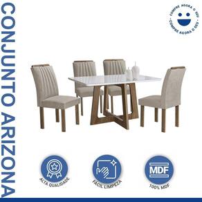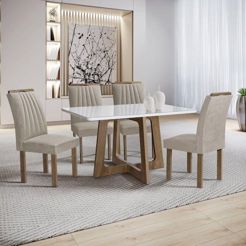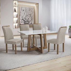 Renove sua sala de jantar com o conjunto Mesa Arizona, acompanhado por quatro cadeiras. A mesa apresenta um design contemporâneo e espaçoso, perfeito para refeições em família e pequenos encontros. As cadeiras oferecem conforto e estilo, criando um ambiente acolhedor para suas refeições. Juntos, este conjunto proporciona uma experiência agradável e elegante à mesa. Medida da Mesa (A x L x P): 79cmx120cmx90cm Peso da Mesa: 46 kg Mesa suporta até: 40.0000 Acabamento da Cadeira/Banco: Pintura Acabamento da Mesa: Pintura UV Acompanha Manual de Instalação: Sim Almofada do assento: Fixa Almofada do encosto: Fixa Ambiente Principal: Sala de Jantar Cadeira/Banco Estofada: Encosto e Assento Estofados Cadeira/Banco estofada: Encosto e Assento Estofados Cadeira/Banco suporta até: 120.0000 codigo_ean: 7909903605226 Complexidade da Montagem: Alta: deve ser montado por um montador especializado Cor: Chocolate/Off White/Bege Claro Cor do Produto: Chocolate/Off White/Bege Claro De Canto (Canto Alemão): Não Enchimento do Assento: Espuma D-23 Enchimento do Encosto: Espuma D-20 Escala de Brilho: Fosco Espessura do Tampo: 29 mm Estrutura do Assento: MDF Estrutura do Encosto: MDF Formato do Tampo: Retangular Itens Inclusos: 1 Mesa Arizona com 4 cadeiras e manual de montagem Linha ou Coleção: Arizona Manual de Montagem e Instalação: https://product-hub-prd.madeiramadeira.com.br/895735/documents/af0b4cee-b955-4b3c-9be0-807a4c3318f1ESA20DUBAI20CADEIRA20DUBAI.pdf Material da Base da Mesa: MDF Material da Estrutura da Cadeira: MDF Material do Tampo: Vidro/MDF Material Principal: MDF Material Principal das Cadeiras/Bancos: MDF Medida da Cadeira/Banco (A x L x P): 97,5cmx58cmx44cm Medida do Tampo (L x C x E): 120cmx90cmx2,9cm Mesa Dobrável: Não Mesa Extensível: Não Necessita Montagem: Sim Origem do Produto: Nacional Peso da Cadeira/Banco: 9,1 kg Possui Apoio para Braços: Não Possui Apoio Para os Pés: Não Possui Prateleiras: Não Possui Suporte Giratório: Não Possui Vidro: Sim Quantidade de Cadeiras: 4 Quantidade de Lugares: 04 Recomendações de Uso, Manutenção e Limpeza: Limpar apenas com pano úmido. Revestimento da Cadeira/Banco: Veludo Sistema de Montagem: Parafusos Tipo de Assento: Fixo Tipo de Encosto: Fixo Vidro Temperado: Não