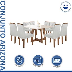 Transforme sua sala de jantar com o conjunto Mesa Arizona, acompanhado por quatro cadeiras. Com sua mesa de linhas modernas e cadeiras estilosas, este conjunto oferece o espaço perfeito para refeições em família ou encontros íntimos. As cadeiras, confortáveis e elegantes, proporcionam uma experiência de jantar agradável. Juntos, criam um ambiente convidativo e sofisticado para desfrutar de momentos especiais à mesa. Medida da Mesa (A x L x P): 79cmx135x135cm Peso da Mesa: 67,5 kg Mesa suporta até: 40.0000 Acabamento da Cadeira/Banco: Pintura Acabamento da Mesa: Pintura UV Acompanha Manual de Instalação: Sim Almofada do assento: Fixa Ambiente Principal: Sala de Jantar Cadeira/Banco Estofada: Encosto e Assento Estofados Cadeira/Banco estofada: Encosto e Assento Estofados Cadeira/Banco suporta até: 120.0000 codigo_ean: 7909903600658 Complexidade da Montagem: Alta: deve ser montado por um montador especializado Cor: Chocolate/Off White/Boucle Gelo Cor do Produto: Chocolate/Off White/Boucle Gelo De Canto (Canto Alemão): Não Enchimento do Assento: Espuma D-23 Enchimento do Encosto: Espuma D-20 Escala de Brilho: Fosco Espessura do Tampo: 29 mm Estrutura do Assento: MDF Estrutura do Encosto: MDF Formato do Tampo: Quadrado Itens Inclusos: 1 Mesa Arizona com 8 cadeiras e manual de montagem Linha ou Coleção: Arizona Manual de Montagem e Instalação: https://product-hub-prd.madeiramadeira.com.br/895814/documents/7514c94f-441b-4588-91f5-79939a8857d8ESA20DUBAI20CADEIRA20DUBAI.pdf Material da Base da Mesa: MDF Material da Estrutura da Cadeira: MDF Material do Tampo: Vidro/MDF Material Principal: MDF Material Principal das Cadeiras/Bancos: MDF Medida da Cadeira/Banco (A x L x P): 97,5cmx58cmx44cm Medida do Tampo (L x C x E): 135cmx135cmx2,9cm Mesa Dobrável: Não Mesa Extensível: Não Necessita Montagem: Sim Origem do Produto: Nacional Peso da Cadeira/Banco: 9,1 kg Possui Apoio para Braços: Não Possui Apoio Para os Pés: Não Possui Prateleiras: Não Possui Suporte Giratório: Não Possui Vidro: Sim Quantidade de Cadeiras: 4 Quantidade de Lugares: 08 Recomendações de Uso, Manutenção e Limpeza: Limpar apenas com pano úmido. Revestimento da Cadeira/Banco: Veludo Sistema de Montagem: Parafusos Tipo de Assento: Fixo Tipo de Encosto: Fixo