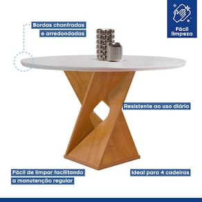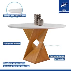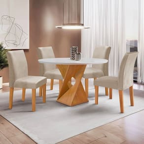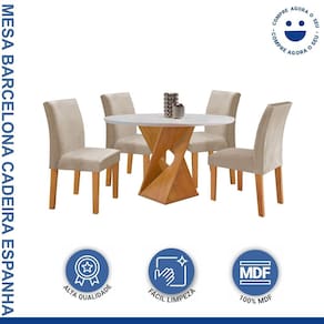 Este conjunto é ideal para quem busca unir estilo e praticidade em ambientes compactos. O tampo redondo de 100cm proporciona uma atmosfera aconchegante e moderna, perfeita para refeições em família ou com amigos. As cadeiras oferecem conforto e um toque de sofisticação, enquanto a estrutura robusta garante durabilidade. O design slim além de otimizar o espaço, permite fácil movimentação. Além disso, a superfície é fácil de limpar, mantendo uma mesa sempre impecável. Um excelente investimento para valorizar sua sala de jantar! Medida da Mesa (A x L x P): 79cmx100cmx100cm Peso da Mesa: 31 kg Mesa suporta até: 30 kg Acabamento da Cadeira/Banco: Pintura Acabamento da Mesa: Pintura UV Almofada do assento: Fixa Ambiente Principal: Sala de Jantar Cadeira/Banco estofada: Encosto e Assento Estofados Cadeira/Banco suporta até: 120 kg Complexidade da Montagem: Alta: deve ser montado por um montador especializado Cor: Cinamomo/Off White/Bege Claro Cor do Produto: Cinamomo/Off White/Bege Claro Cor Secundária: Marrom De Canto (Canto Alemão): Não Enchimento do Assento: Espuma D-23 Enchimento do Encosto: Espuma D-20 Escala de Brilho: Fosco Espessura do Tampo: 25 mm Estrutura do Assento: MDF Estrutura do Encosto: MDF/Espuma Formato do Tampo: Redondo Itens Inclusos: 1 Mesa 4 Cadeiras e Manual de Montagem Linha ou Coleção: Barcelona Manual de Montagem e Instalação: https://product-hub-prd.madeiramadeira.com.br/934972/documents/a09e4de7-9078-4bf0-969a-da301ab03516ONA20COM20CADEIRA20ESPANHA.pdf Material da Base da Mesa: MDF Material da Estrutura da Cadeira: MDF Material do Tampo: MDF Material Principal: MDF Medida da Base (A x L x P): 77cmx45cmx45cm Medida da Cadeira/Banco (A x L x P): 95cmx44cmx56cm Medida do Tampo (L x C x E): 100cmx100cmx29mm Mesa Extensível: Não Necessita Montagem: Sim Origem do Produto: Nacional Peso da Cadeira/Banco: 9,2 kg Possui Apoio para Braços: Não Possui Apoio Para os Pés: Não Possui Suporte Giratório: Não Quantidade de Lugares: 04 Recomendações de Uso, Manutenção e Limpeza: Limpeza com pano macio e levemente umedecido. Não utilizar solventes a base e de inflamáveis. Não utilizar produtos abrasivos. Revestimento da Cadeira/Banco: Veludo Sistema de Montagem: Parafusos