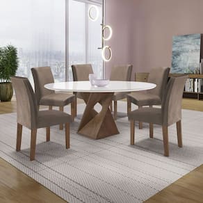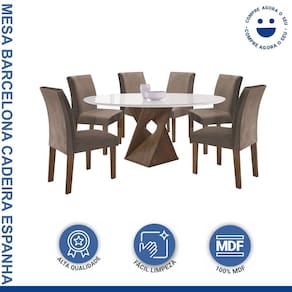O conjunto de mesa Barcelona 120cmx120cm com 6 cadeiras é ideal para quem busca um ambiente elegante e acolhedor. Com um tampo redondo de 120cm, a mesa oferece amplo espaço para refeições em família ou com amigos. As cadeiras confortáveis ??garantem um assento agradável durante longas refeições. O design otimiza o espaço, facilitando o deslocamento ao redor da mesa. Além disso, a superfície é fácil de limpar, mantendo uma mesa sempre impecável. Uma excelente opção para quem deseja aliar funcionalidade e estilo em sua sala de jantar! Medida da Mesa (A x L x P): 79cmx120cmx120cm Peso da Mesa: 39,8 kg Mesa suporta até: 30 kg Acabamento da Cadeira/Banco: Pintura Acabamento da Mesa: Pintura UV Almofada do assento: Fixa Ambiente Principal: Sala de Jantar Cadeira/Banco estofada: Encosto e Assento Estofados Cadeira/Banco suporta até: 120 kg Complexidade da Montagem: Alta: deve ser montado por um montador especializado Cor: Chocolate/Off White/Bege Escuro Cor do Produto: Chocolate/Off White/Bege Escuro Cor Secundária: Marrom De Canto (Canto Alemão): Não Enchimento do Assento: Espuma D-23 Enchimento do Encosto: Espuma D-20 Escala de Brilho: Fosco Espessura do Tampo: 29 mm Espessura do Vidro: mm Estrutura do Assento: MDF Estrutura do Encosto: MDF/Espuma Formato do Tampo: Redondo Itens Inclusos: 1 Mesa 6 Cadeiras e Manual de Montagem Linha ou Coleção: Barcelona Manual de Montagem e Instalação: https://product-hub-prd.madeiramadeira.com.br/934992/documents/3bb0280d-4d02-4e1b-b160-f09889775573ONA20COM20CADEIRA20ESPANHA.pdf Material da Base da Mesa: MDF Material da Estrutura da Cadeira: MDF Material do Tampo: Vidro/MDF Material Principal: MDF Medida da Base (A x L x P): 77cmx45cmx45cm Medida da Cadeira/Banco (A x L x P): 95cmx44cmx56cm Medida do Tampo (L x C x E): 120cmx120cmx29mm Mesa Extensível: Não Necessita Montagem: Sim Origem do Produto: Nacional Peso da Cadeira/Banco: 9,2 kg Possui Apoio para Braços: Não Possui Apoio Para os Pés: Não Possui Suporte Giratório: Não Quantidade de Lugares: 06 Recomendações de Uso, Manutenção e Limpeza: Limpeza com pano macio e levemente umedecido. Não utilizar solventes a base e de inflamáveis. Não utilizar produtos abrasivos. Revestimento da Cadeira/Banco: Veludo Sistema de Montagem: Parafusos