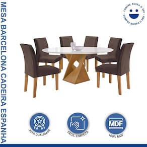 O conjunto de mesa Barcelona 120cmx120cm com 6 cadeiras é ideal para quem busca um ambiente elegante e acolhedor. Com um tampo redondo de 120cm, a mesa oferece amplo espaço para refeições em família ou com amigos. As cadeiras confortáveis ??garantem um assento agradável durante longas refeições. O design otimiza o espaço, facilitando o deslocamento ao redor da mesa. Além disso, a superfície é fácil de limpar, mantendo uma mesa sempre impecável. Uma excelente opção para quem deseja aliar funcionalidade e estilo em sua sala de jantar! Medida da Mesa (A x L x P): 79cmx120cmx120cm Peso da Mesa: 39,8 kg Mesa suporta até: 30 kg Acabamento da Cadeira/Banco: Pintura Acabamento da Mesa: Pintura UV Almofada do assento: Fixa Ambiente Principal: Sala de Jantar Cadeira/Banco estofada: Encosto e Assento Estofados Cadeira/Banco suporta até: 120 kg Complexidade da Montagem: Alta: deve ser montado por um montador especializado Cor: Cinamomo/Off White/Marrom Cor do Produto: Cinamomo/Off White/Marrom Cor Secundária: Bege De Canto (Canto Alemão): Não Enchimento do Assento: Espuma D-23 Enchimento do Encosto: Espuma D-20 Escala de Brilho: Fosco Espessura do Tampo: 29 mm Espessura do Vidro: mm Estrutura do Assento: MDF Estrutura do Encosto: MDF/Espuma Formato do Tampo: Redondo Itens Inclusos: 1 Mesa 6 Cadeiras e Manual de Montagem Linha ou Coleção: Barcelona Manual de Montagem e Instalação: https://product-hub-prd.madeiramadeira.com.br/935002/documents/dbbf901b-91b2-4bc8-bc03-d14db6737e17ONA20COM20CADEIRA20ESPANHA.pdf Material da Base da Mesa: MDF Material da Estrutura da Cadeira: MDF Material do Tampo: Vidro/MDF Material Principal: MDF Medida da Base (A x L x P): 77cmx45cmx45cm Medida da Cadeira/Banco (A x L x P): 95cmx44cmx56cm Medida do Tampo (L x C x E): 120cmx120cmx29mm Mesa Extensível: Não Necessita Montagem: Sim Origem do Produto: Nacional Peso da Cadeira/Banco: 9,2 kg Possui Apoio para Braços: Não Possui Apoio Para os Pés: Não Possui Suporte Giratório: Não Quantidade de Lugares: 06 Recomendações de Uso, Manutenção e Limpeza: Limpeza Com Pano Macio e Levemente Umedecido. Não Utilizar Solventes a Base e de Inflamáveis. Não Utilizar Produtos Abrasivos. Revestimento da Cadeira/Banco: Veludo Sistema de Montagem: Parafusos