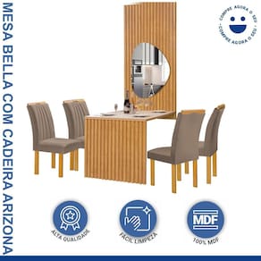 Dê um toque de charme à sua sala de jantar com o conjunto Mesa Bella, acompanhado por quatro cadeiras. A mesa, com seu design refinado e acabamento impecável, torna-se o centro das atenções, oferecendo um espaço generoso para refeições memoráveis. As cadeiras, elegantes e confortáveis, completam o conjunto, proporcionando o ambiente ideal para desfrutar de momentos especiais com sua família e amigos. Transforme sua sala de jantar em um espaço acolhedor e elegante com o conjunto Mesa Bella. Medida da Mesa (A x L x P): 250cmx120cmx90cm Peso da Mesa: 77,2 kg Mesa suporta até: 40.0000 Acabamento da Cadeira/Banco: Pintura Acabamento da Mesa: Pintura UV Acompanha Manual de Instalação: Sim Almofada do assento: Fixa Ambiente Principal: Sala de Jantar Cadeira/Banco Estofada: Encosto e Assento Estofados Cadeira/Banco estofada: Encosto e Assento Estofados Cadeira/Banco suporta até: 120.0000 codigo_ean: 7909903600580 Complexidade da Montagem: Alta: deve ser montado por um montador especializado Cor: Cinamomo/Off White/Veludo Bege Escuro Cor do Produto: Cinamomo/Off White/Veludo Bege Escuro De Canto (Canto Alemão): Não Enchimento do Assento: Espuma D-23 Enchimento do Encosto: Espuma D-20 Escala de Brilho: Fosco Espessura do Tampo: 29 mm Estrutura do Assento: MDF Estrutura do Encosto: MDF Formato do Tampo: Retangular Itens Inclusos: 1 Mesa Bella com 4 cadeiras e manual de montagem Linha ou Coleção: Bella Manual de Montagem e Instalação: https://product-hub-prd.madeiramadeira.com.br/895787/documents/69de96ca-360a-4f69-af86-b8898410dd12A20CANELA2020CANCUN20DUBAI.pdf Material da Base da Mesa: MDF Material da Estrutura da Cadeira: MDF Material do Tampo: Vidro/MDF Material Principal: MDF Material Principal das Cadeiras/Bancos: MDF Medida da Cadeira/Banco (A x L x P): 97,5cmx58cmx44cm Medida do Tampo (L x C x E): 120cmx90cmx2,9cm Mesa Dobrável: Não Mesa Extensível: Não Necessita Montagem: Sim Origem do Produto: Nacional Peso da Cadeira/Banco: 9,1 kg Possui Apoio para Braços: Não Possui Apoio Para os Pés: Não Possui Prateleiras: Não Possui Suporte Giratório: Não Possui Vidro: Sim Quantidade de Cadeiras: 4 Quantidade de Lugares: 04 Recomendações de Uso, Manutenção e Limpeza: Limpar apenas com pano úmido. Revestimento da Cadeira/Banco: Veludo Sistema de Montagem: Parafusos Tipo de Assento: Fixo Tipo de Encosto: Fixo