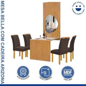 Dê um toque de charme à sua sala de jantar com o conjunto Mesa Bella, acompanhado por quatro cadeiras. A mesa, com seu design refinado e acabamento impecável, torna-se o centro das atenções, oferecendo um espaço generoso para refeições memoráveis. As cadeiras, elegantes e confortáveis, completam o conjunto, proporcionando o ambiente ideal para desfrutar de momentos especiais com sua família e amigos. Transforme sua sala de jantar em um espaço acolhedor e elegante com o conjunto Mesa Bella. Medida da Mesa (A x L x P): 250cmx120cmx90cm Peso da Mesa: 77,2 kg Mesa suporta até: 40.0000 Acabamento da Cadeira/Banco: Pintura Acabamento da Mesa: Pintura UV Acompanha Manual de Instalação: Sim Almofada do assento: Fixa Ambiente Principal: Sala de Jantar Cadeira/Banco Estofada: Encosto e Assento Estofados Cadeira/Banco estofada: Encosto e Assento Estofados Cadeira/Banco suporta até: 120.0000 codigo_ean: 7909903600573 Complexidade da Montagem: Alta: deve ser montado por um montador especializado Cor: Cinamomo/Off White/Veludo Marrom Cor do Produto: Cinamomo/Off White/Veludo Marrom De Canto (Canto Alemão): Não Enchimento do Assento: Espuma D-23 Enchimento do Encosto: Espuma D-20 Escala de Brilho: Fosco Espessura do Tampo: 29 mm Estrutura do Assento: MDF Estrutura do Encosto: MDF Formato do Tampo: Retangular Itens Inclusos: 1 Mesa Bella com 4 cadeiras e manual de montagem Linha ou Coleção: Bella Manual de Montagem e Instalação: https://product-hub-prd.madeiramadeira.com.br/895776/documents/d9bbe193-0579-4bd7-84c4-63ff8c821077A20CANELA2020CANCUN20DUBAI.pdf Material da Base da Mesa: MDF Material da Estrutura da Cadeira: MDF Material do Tampo: Vidro/MDF Material Principal: MDF Material Principal das Cadeiras/Bancos: MDF Medida da Cadeira/Banco (A x L x P): 97,5cmx58cmx44cm Medida do Tampo (L x C x E): 120cmx90cmx2,9cm Mesa Dobrável: Não Mesa Extensível: Não Necessita Montagem: Sim Origem do Produto: Nacional Peso da Cadeira/Banco: 9,1 kg Possui Apoio para Braços: Não Possui Apoio Para os Pés: Não Possui Prateleiras: Não Possui Suporte Giratório: Não Possui Vidro: Sim Quantidade de Cadeiras: 4 Quantidade de Lugares: 04 Recomendações de Uso, Manutenção e Limpeza: Limpar apenas com pano úmido. Revestimento da Cadeira/Banco: Veludo Sistema de Montagem: Parafusos Tipo de Assento: Fixo Tipo de Encosto: Fixo