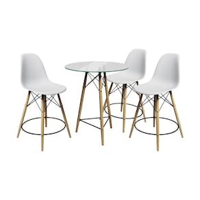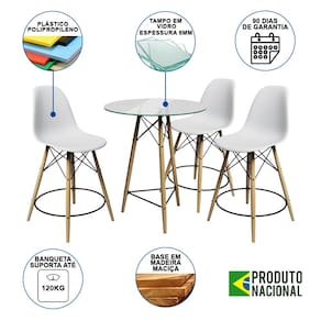 Conjunto mesa bistrô eames eiffel vidro com 3 banquetas brancas de madeira O conjunto de mesa e banqueta eames eiffel bistrô possui um design moderno cheio de charme, fabricado com material de alta qualidade, proporcionando o melhor conforto e sem perder o estilo. A banqueta possui uma curvatura ergonômica que se encaixa perfeitamente ao corpo, ficando ainda mais completo com a mesa. Tipo: conjunto Modelo: bistrô Cor da mesa: vidro Cor da banqueta: branco Características Produto nacional Base: madeira maciça Tampo da mesa: vidro Assento: plástico polipropileno Banqueta suporta: até 120kg Garantia: 90 dias Dimensões da banqueta Altura: 115cm Altura até o assento: 70cm Largura: 45cm Comprimento: 45cm Dimensões da mesa Altura: 97cm Diâmetro: 60cm Imagens meramente ilustrativas, podendo haver uma pequena variação na cor dependendo de cada tela ou monitor. Objetos da imagem ambientada não acompanham o produto. Ean: 7897745535552