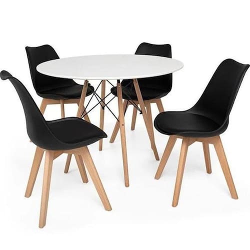 Conjunto mesa branca eames 90cm e 4 cadeiras leda preta Modelo cadeira leda saarinen design Composição polipropileno Acabamento da mesa mdf Suporta até kg 120 Cor branco e preto Garantia 03 meses Material mdf Materialfamily mdf Mesa de jantar redonda 90cm cor: brancadiâmetro: 90cm altura: 75cm tampo em mdf 4 cadeiras leda - charles eames, saarinen wood com almofada preta assento em polipropileno com almofada em pu base em madeira com acabamento arredondado largura 49cm profundidade 43cm altura até o assento 45cm altura até o encosto 82cmobs: montagem não inclusa. Acompanha manual de instruções e chave para a montagem.