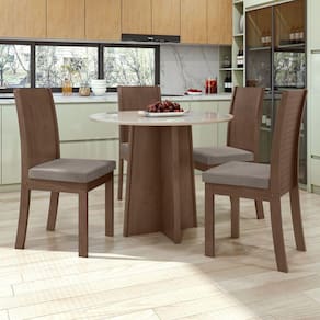 Conjunto Sala de Jantar Mesa Celebrare 100x100cm Tampo MDF/Vidro com 4 Cadeiras Athenas Móveis Lopas Medida da Mesa (A x L x P): 78,5cmx100cmx100cm Peso da Mesa: 31.97 Mesa suporta até: 50 Acabamento da Cadeira/Banco: Pintura Acabamento da Mesa: Pintura UV Almofada do assento: Fixa Ambiente Principal: Sala de Jantar Cadeira/Banco estofada: Somente Assento Estofado Cadeira/Banco suporta até: 120 Complexidade da Montagem: Alta: deve ser montado por um montador especializado Cor: Amendoa Clean/Off White/Suede Animale Bege Cor da Base: Marrom Cor do Produto: Amêndoa Clean/Off White/Suede Animale Bege Cor do Tampo: Bege Cor Secundária: Bege De Canto (Canto Alemão): Não Enchimento do Assento: Espuma D-20 Escala de Brilho: Fosco Espessura do Tampo: 22 Espessura do Vidro: mm Estrutura do Assento: MDP Estrutura do Encosto: MDF Formato do Tampo: Redondo Itens Inclusos: 1 Mesa, 4 Cadeiras, Kit Ferragens e Manual de Montagem. Manual de Montagem e Instalação: https://cdn2.madeiramadeira.com.br/atributo/mOveis-lopas/1146563-conjunto-mesa-celebrare-100-redonda-e-cadeira-athenas.pdf Material da Base da Mesa: MDF Material da Estrutura da Cadeira: MDF/MDP Material do Tampo: Vidro/MDF Medida da Base (A x L x P): 73,5cmx50cmx50cm Medida da Cadeira/Banco (A x L x P): 101cmx54cmx45cm Medida do Tampo (L x C x E): 100cmx100cmx22mm Mesa Extensível: Não Necessita Montagem: Sim Origem do Produto: Nacional Peso da Cadeira/Banco: 8.5 Possui Apoio para Braços: Não Possui Apoio Para os Pés: Não Possui Suporte Giratório: Não Quantidade de Lugares: 04 Recomendações de Uso, Manutenção e Limpeza: Limpar com pano macio e levemente umedecido. Não utilizar solventes a base e de inflamáveis. Não utilizar produtos abrasivos. Revestimento da Cadeira/Banco: Suede Sistema de Montagem: Parafusos. Vidro Temperado: Sim