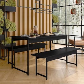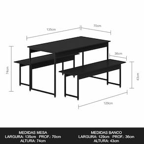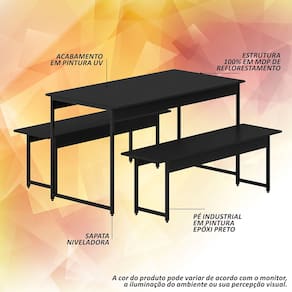 Conjunto de Mesa com 2 Bancos Lugano, inspirado no design industrial, traz funcionalidade e estilo. A estrutura em preto fosco cria um visual contemporâneo e minimalista, enquanto os bancos proporcionam e praticidade para o dia.