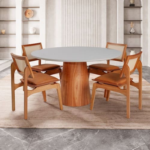 O Conjunto Mesa Daren com 4 cadeiras de Madeira Maciça Tauari, Rattan Natural e Estofada Daren uniu design moderno à resistência da madeira Maciça, indo além do estilo e modernidade.