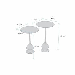 Composto por 02 mesas, tampos redondos com borda invertida, base diamante fabricada com usinagem de alta precisão, haste em metal maçiço, disco em metal para melhor sustentação.
