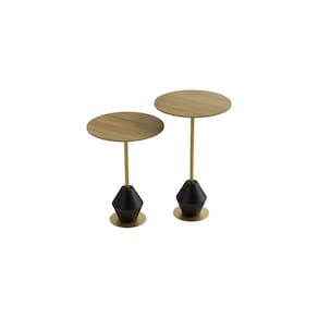 Composto por 02 mesas, tampos redondos com borda invertida em Lamina natural de Tawary , base diamante na cor preta, fabricada com usinagem de alta precisão, haste em metal maçiço, disco em metal para melhor sustentação.