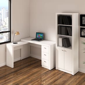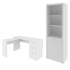 Transforme seu ambiente de trabalho com o Conjunto para Escritório Mesa em L e Armário Estante 2 Peças Branco da Tecnomobili, que une estilo, funcionalidade e organização em um só lugar. Produzido em MDP com acabamento BP, ele é composto por uma mesa escrivaninha com apoio lateral e 3 gavetas, além de um armário de escritório com 2 portas e prateleiras internas. CARACTERÍSTICAS TÉCNICAS: - Produzido em MDP - Acabamento BP e costas na cor Branco - Mesa Escrivaninha em L ME4102: - 3 gavetas para documentos e objetos - Mesa de apoio lateral inclusa - Montagem reversível (esquerda ou direita) - Armário Estante Alto ME4110: 2 portas e 5 prateleiras internas