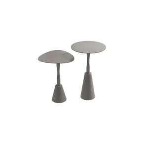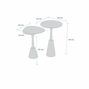 Composto por 02 mesas, tampos redondo e organico, com borda invertida, base cone fabricada com usinagem de alta precisão, haste em madeira maçiça,