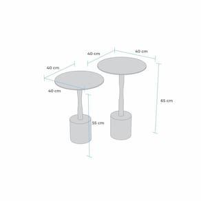 Composto por 02 mesas, tampos redondos, com borda invertida, base cilindrica fabricada com usinagem de alta precisão, haste em madeira maçiça,