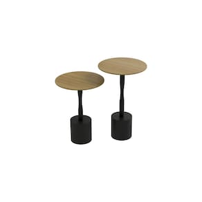Composto por 02 mesas, tampos redondos, com borda invertida, base cilindrica fabricada com usinagem de alta precisão, haste em madeira maçiça,