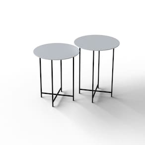 Composto por 02 mesas, tampos redondos, estrutura metalica em aço carbono