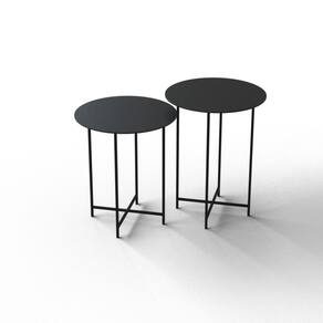 Composto por 02 mesas, tampos redondos, estrutura metalica em aço carbono