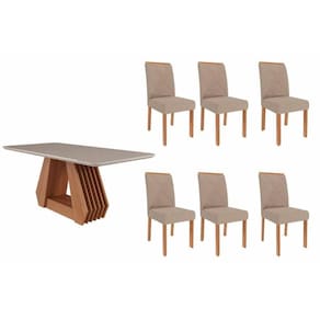 Sala de Jantar Completa Ágata Tampo Madeirado c/ Vidro 180x90cm e 6 Cadeiras Fernanda Cinamomo/Off White - Carvalho/Linho Bege - Cimol